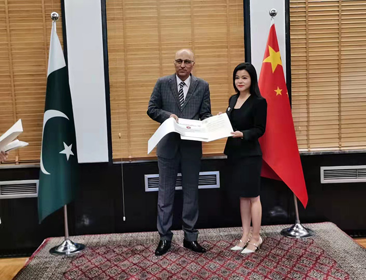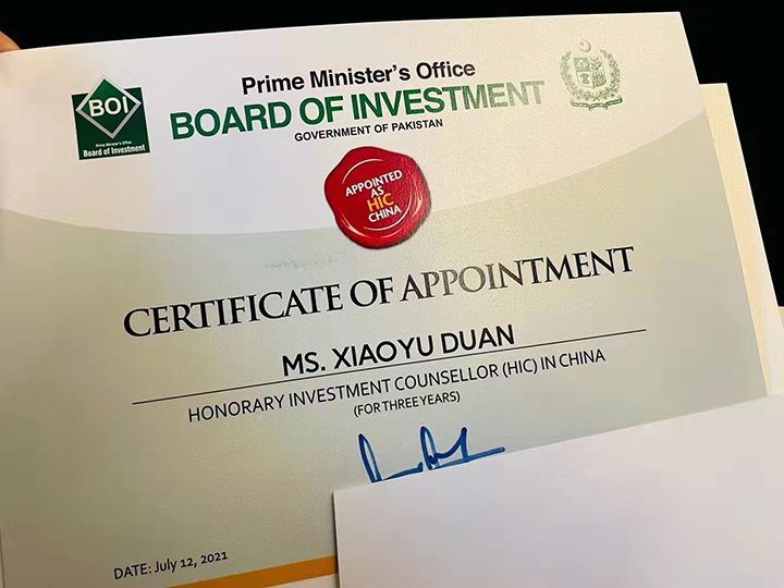 2021年9月15日,巴基斯坦駐華大使館舉行隆重的頒獎儀式,代表巴基斯坦投資委員會(huì )BOI頒發(fā)榮譽(yù)投資參贊證書(shū)。來(lái)自中巴兩國的媒體,政府官員,企業(yè)代表等80多人見(jiàn)證了頒獎儀式。段曉喻董事長(cháng)表示“投資參贊是巴基斯坦投資委員會(huì )對我們的信任,既是一份榮譽(yù)也是沉甸甸的責任,我將致力于為中巴貿易做出應有的貢獻”
